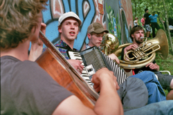 Die Wäsche trocknet an der Sonne, die Wäsche trocknet auch am Wind. Die Wäsche trocknet auch am Li-hicht, wie schön ist das eigentlich? (aus "Wäsche") Ein Lied über Wäsche, die auf der Leine trocknet? Dessen Text aus vier Zeilen besteht, bairisch? Mit Tuba und Akkordeon?!? Ja, gibt es, und ist wirklich toll!! Nachdem seit Jahren jeder musikalische Pups sofort weltweit verfügbar gemacht und gehyped wird, es eigentlich unmöglich ist, noch etwas Neues zu machen, haben KOFELGSCHROA es einfach getan, und zwar ohne viel Aufhebens. Die vier jungen Bayern aus Oberammergau tragen ihren Hausberg, den Kofel im Namen, singen – natürlich – bairisch, ihre Instrumente sind ganz nah an Volksmusik. Tenorhorn, Helikontuba, Flügelhorn, Gitarre und Akkordeon, dazu der Gesang, oft mehrstimmig, aber auch Sprechen, Erzählen und nur wenig Geschrei ('Gschroa'). Die Punkte, die den Unterschied zu Volksmusik aus- und MARTIN und MICHAEL VON MÜCKE, MAXI PONGRATZ und MATTHIAS MEICHELBÖCK einmalig machen, sind schwer zu definieren, besser zu erfühlen. Zum einen sind es sicherlich die teils dadaistischen Texte, die vorwiegend Alltagssituationen und -gedanken beschreiben. Es ist das ganz und gar nicht volkstümliche Auftreten, was in Bayern offenbar fast schon genügt, um als 'punkig' zu gelten. Es ist aber noch mehr, was sich in Vokabeln wie 'verschroben' oder 'krautig' äußert, die durch die vorwiegend bayerische Medienlandschaft wandern. (Mit denen übrigens auch gerne die Oberösterreicher von ATTWENGER bezeichnet werden, um einen Vergleich zu setzen.) KOFELGSCHROA verkörpern, oft in Moll-Akkorden, ein äußerst melancholisches Lebensgefühl, eine starke Sehnsucht nach einfachen, irdischen Dingen. Man möchte beim Hören ihres eben erschienenen Debütalbums "Kofelgschroa" nach Bayern aufs Land fahren und der Wäsche beim Trocknen zuschauen! Auch der Dialekt trägt seinen Teil zu diesem Gefühl bei, ein uriges, knarziges Bairisch, so typisch und stellvertretend wie kaum ein Dialekt für ein Bundesland. Es ist sicher kein Zufall, dass in den vergangenen Jahren zunehmend bayerische Musiker in allen Sparten erfolgreich sind. Als Beispiel seien LABRASSBANDA vom selben Label (TRIKONT) wie KOFELGSCHROA genannt, eine Blasmusik-Boyband, die in ihrer kurzen Geschichte schon mehr als 500 Konzerte feierte und in diesem Jahr die Festivals HURRICANE und SOUTHSIDE bespielte. Auch die Serie "Stimmen Bayerns", eine Anthologie der bayerischen Seele (und ebenfalls auf TRIKONT erschienen), wird begeistert rezipiert. Über Bayern, Volksmusik, Dialekt und Trachten habe ich mit MATTHIAS (Tenorhorn) von KOFELGSCHROA gesprochen. => Interview ![]()