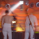 Nach einer kurzen Umbaupause betraten gegen 22:15 Uhr die Helden des deutschen Industrial THOROFON die Bühne. Ganz in weiß gekleidet präsentierten Madame Genevieve Pasquier und Anton Knilpert, ein vorletztes mal vor dem Einstellen des Projekts, ihren einzigartigen Minimal-Industrial. Mit Titeln von krachig-noisig bis hin zu minimal-psycho-poppig zogen sie das Publikum in ihren Bann. Madame Pasquier und Herr Knilpert wechselten sich während des Konzerts am Mikrofon ab und gelegentlich quälte Herr Knilpert einer E-Gitarre kreischende Geräusche ab oder bereicherte die Musik mit interessanten Rückkoppelungen, welche er mit Hilfe eines Mikrofons und einer Monitorbox erzeugte. Sehr wirkungsvoll fand ich die unterschiedliche Darbietung der beiden am Mikrofon. Seine Vokalarbeit reichte von Sprechgesang bis hin zum brachialen Schreien. Dabei legte er sich bewegungsfreudig aggressiv-effektvoll ins Zeug und scheute auch einen Sprung ins Publikum nicht. Lustig empfand ich die Reaktion der umstehenden Leute, denen soviel Nähe zum Künstler wohl irgendwie unheimlich war. Madame Pasquier ließ wiederum eine kühle, unnahbare Erotik auf das Publikum wirken und während sie sich lasziv-elegant vor ihrem Retro-Mikrofon bewegte, präsentierte sie dem entzückten Auditorium ein Stimmspektrum von zart-lieblich bis hin zum punkigen Schreien, welches mich ein wenig an HANIN ELIAS erinnerte. Nach 75 Minuten verabschiedeten sich THOROFON mit einer Zugabe von der Bühne. Eine geniale Darbietung.